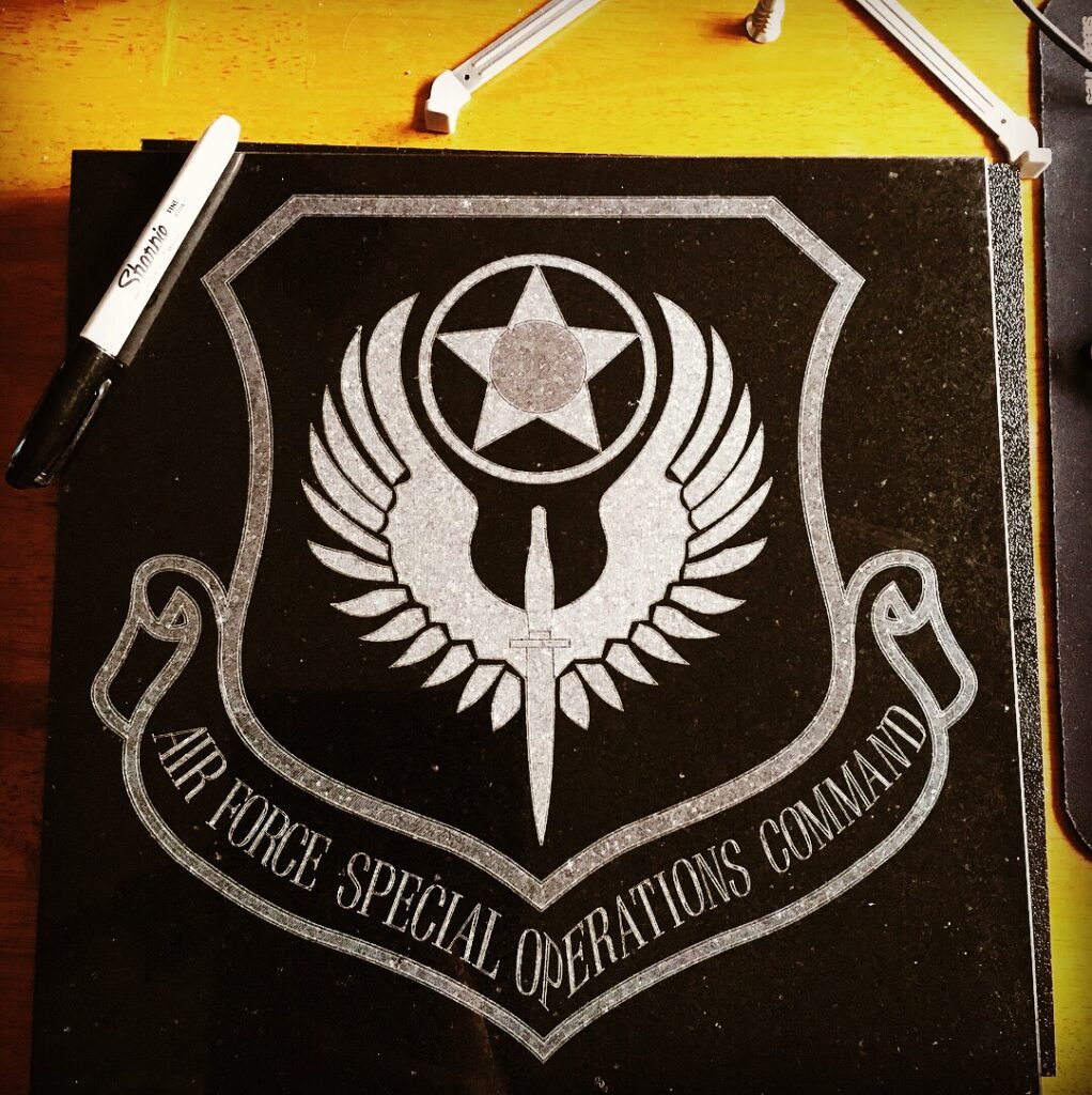 Using a diamond bit, custom images and letters can be engraved on granite.